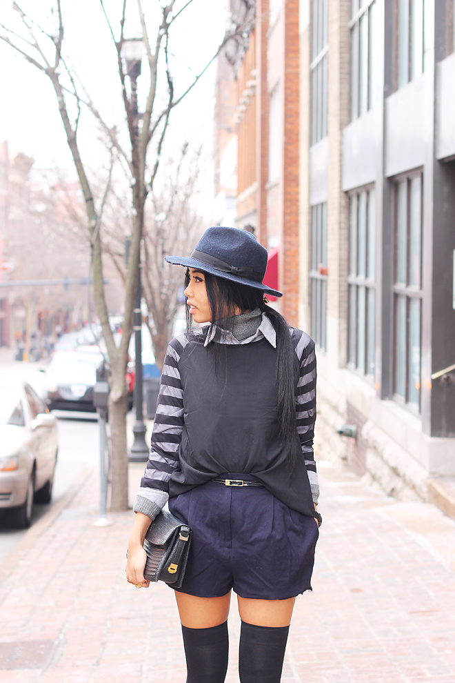 Whenever I wear thigh highs by themselves, I either feel like a) super kawaii azn b) preppy skool gurl or c) super preppy kawaii azn skool gurl ((combo of both)). I hope neither came off in today's outfit because I was sort of aiming for a more...androgynous feel I suppose. Less girly, that's all.